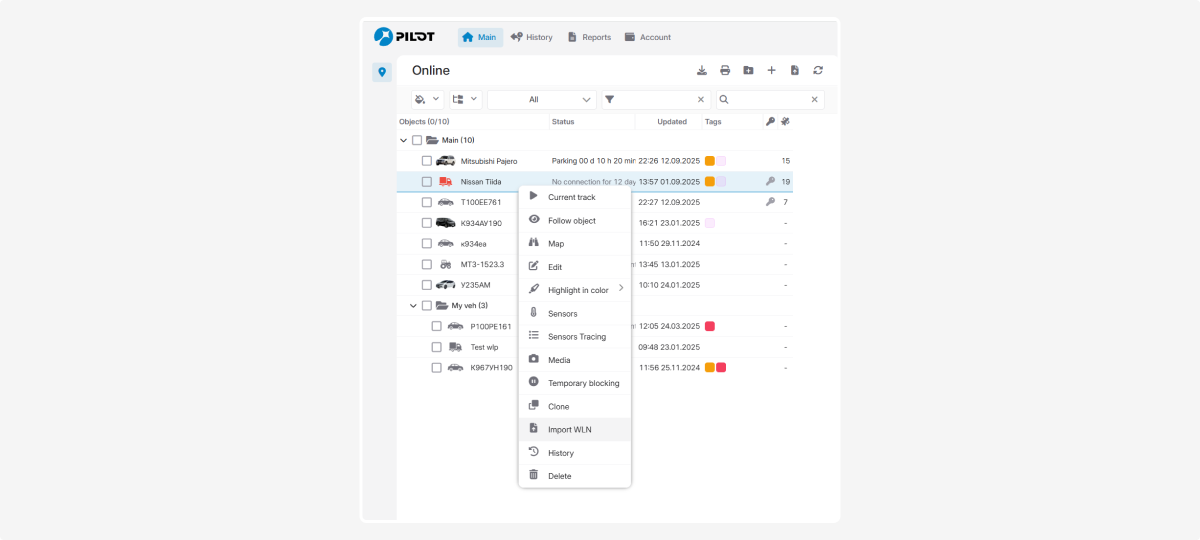 In Wialon, select the object and parameters, then download a WLN file2. In PILOT, find the object in the list to which you want to transfer the history3. Right-click the object — the object menu will open4. In the object menu, select Import WLN
