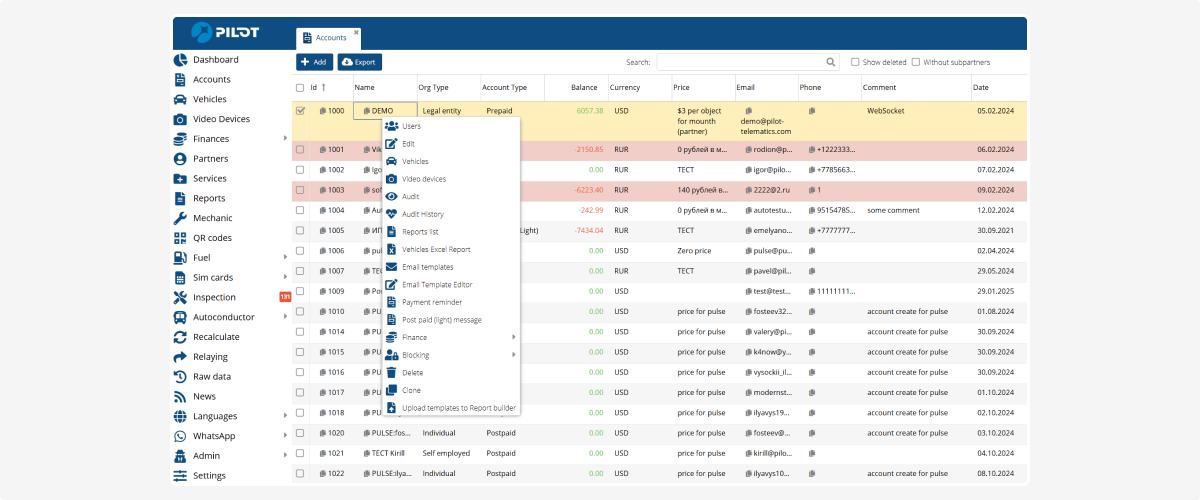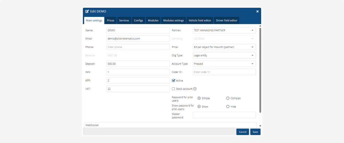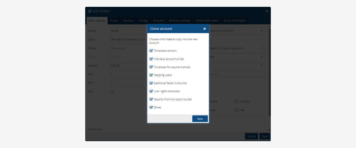 • Sensor templates – all sensor settings and templates (fuel, temperature, doors, etc.)