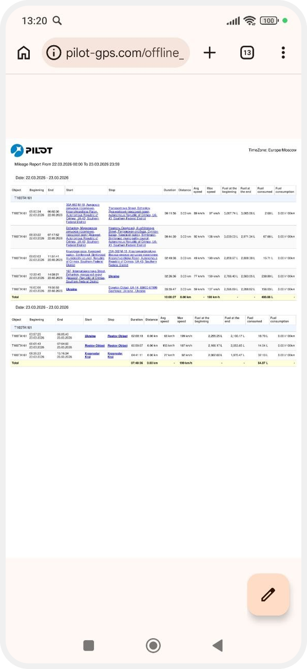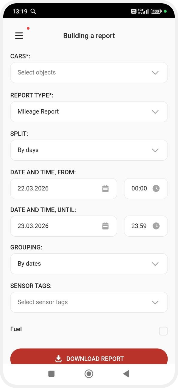 In the Reports tab, you can generate reports based on selected vehicles and parameters.