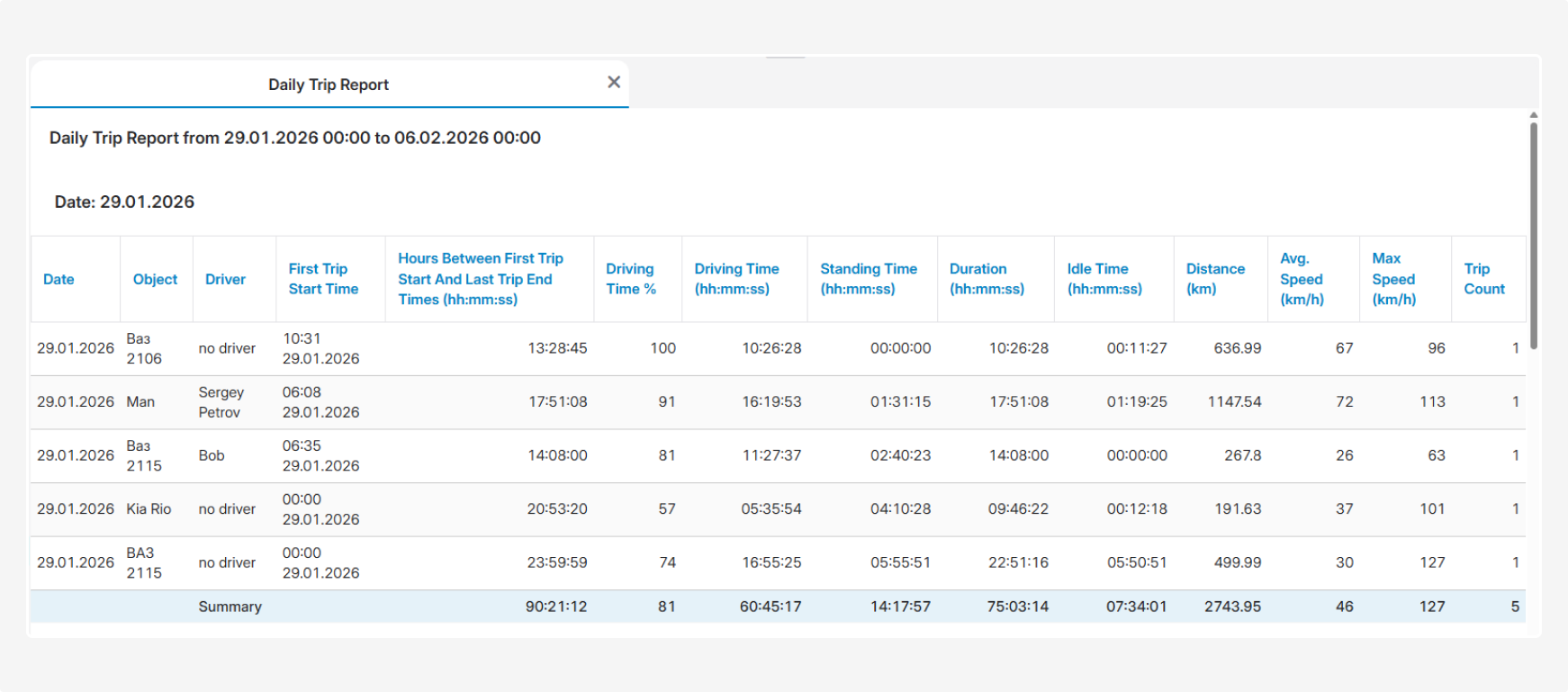 • Standing time (hh:mm:ss) — total time of stops and parking between trips