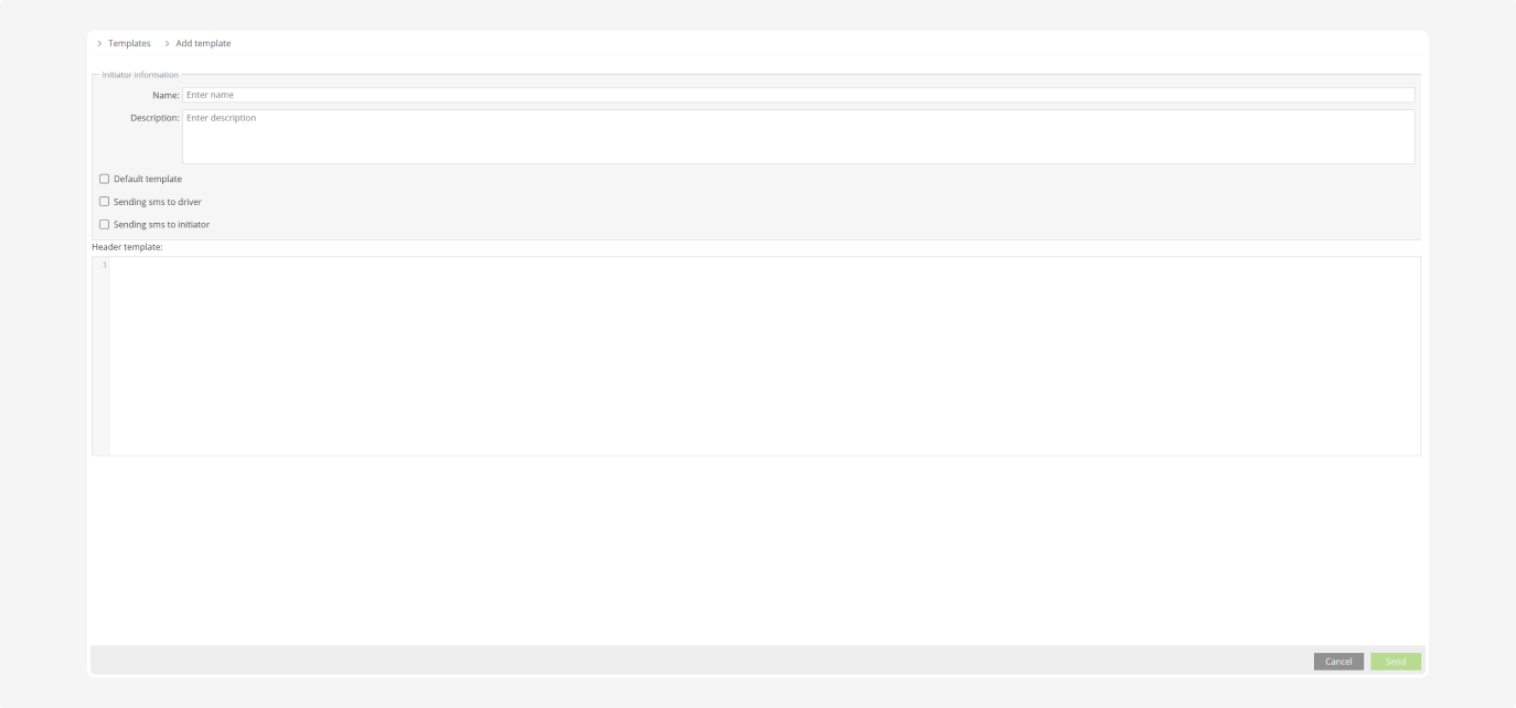 Send SMS to initiator — sends an SMS to the task creator4. Header template — technical configuration for table headers and Excel exports (contact support if you’re unsure)5. Click Send. The template will appear in the list