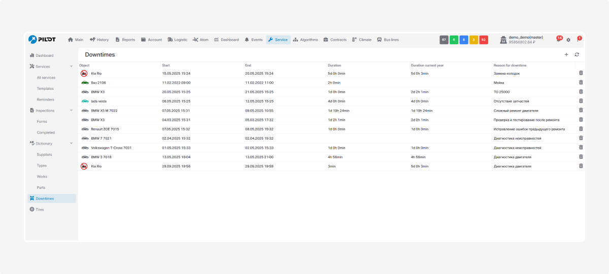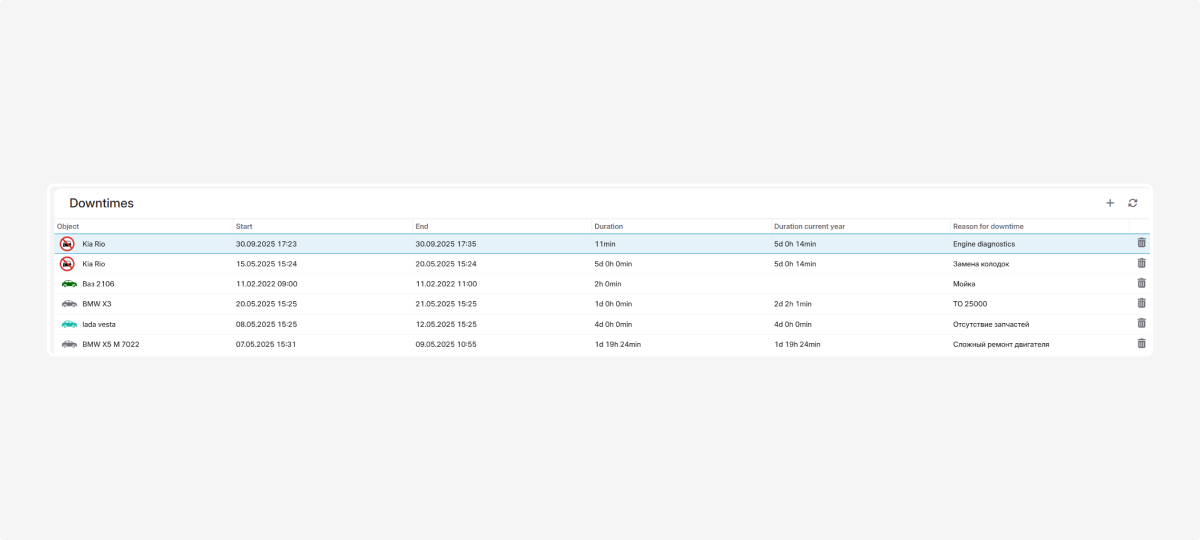 In the Downtimes tab, you will see all records of vehicle downtime periods.