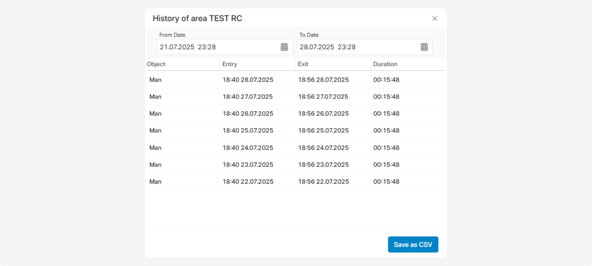 If you want to save the movement or event history for the geofence, click the Save as CSV button.