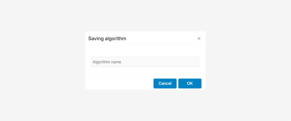 In the dialog that appears, enter the algorithm name and click OK. The algorithm will be saved and become available in the list.