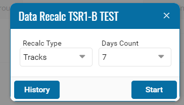 Recalculation Go to the context menu of the object. Select the Data recalculation item. Recalculation can be done by trips and zones. • Select type. • Set number of days. • Press start. • Use history.