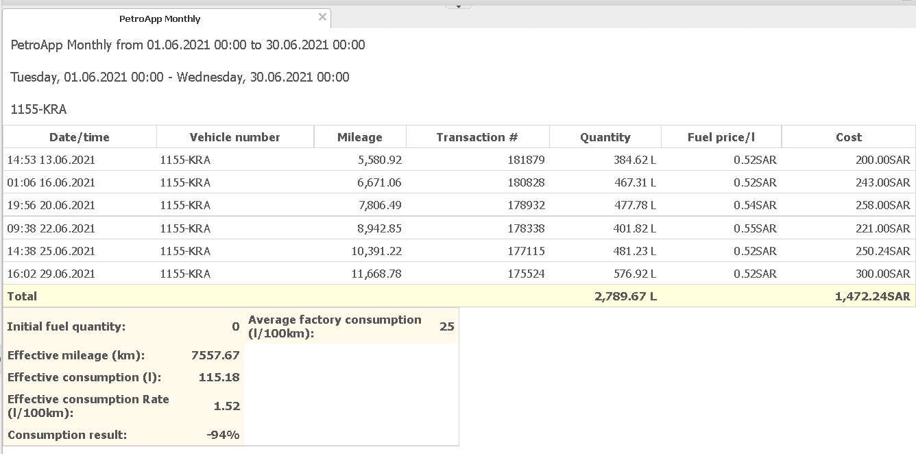 • Effective consumption (Liters) - the sum of all liters from transactions.