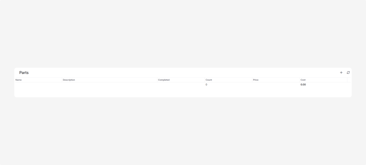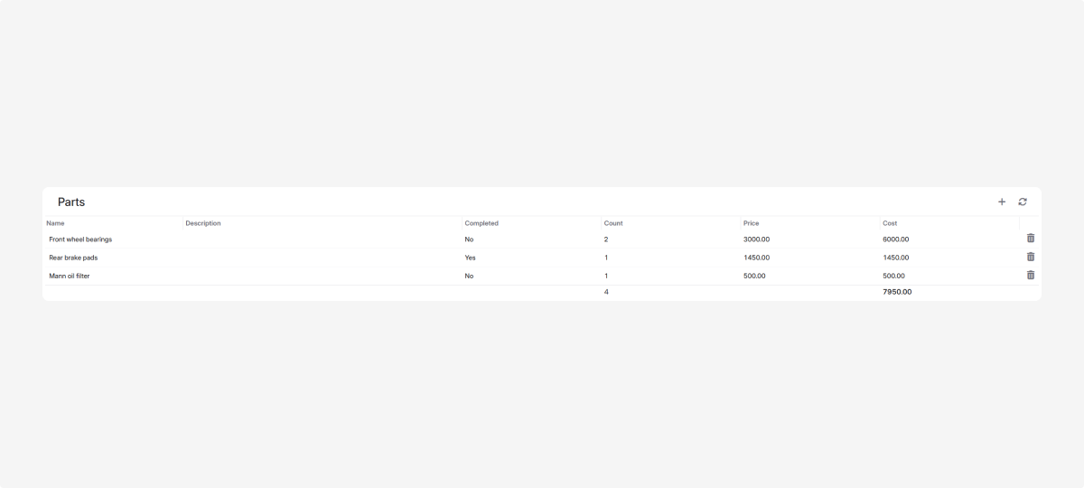 Added parts will appear in the spare parts list, and their total cost will be calculated automatically.