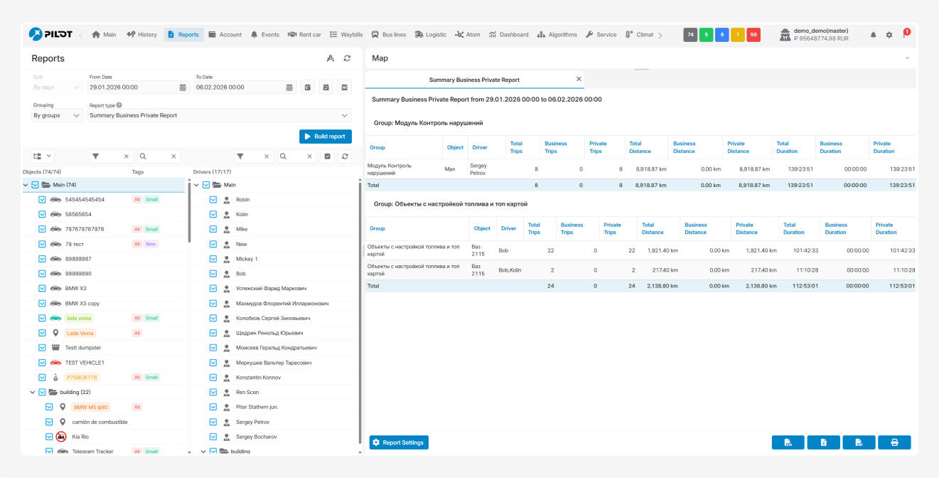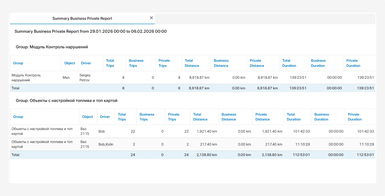 This report provides information on drivers’ trips, separating them into business and personal trips. It helps analyze how much time and distance drivers spent on work-related and personal travel.
