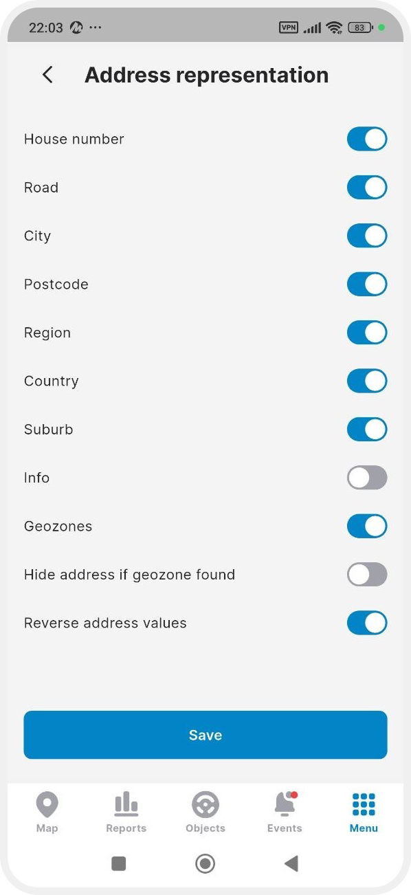 Hide address if geofence exists — when enabled, the system will display only the geofence name if the object is located inside a geofence, instead of the full address.