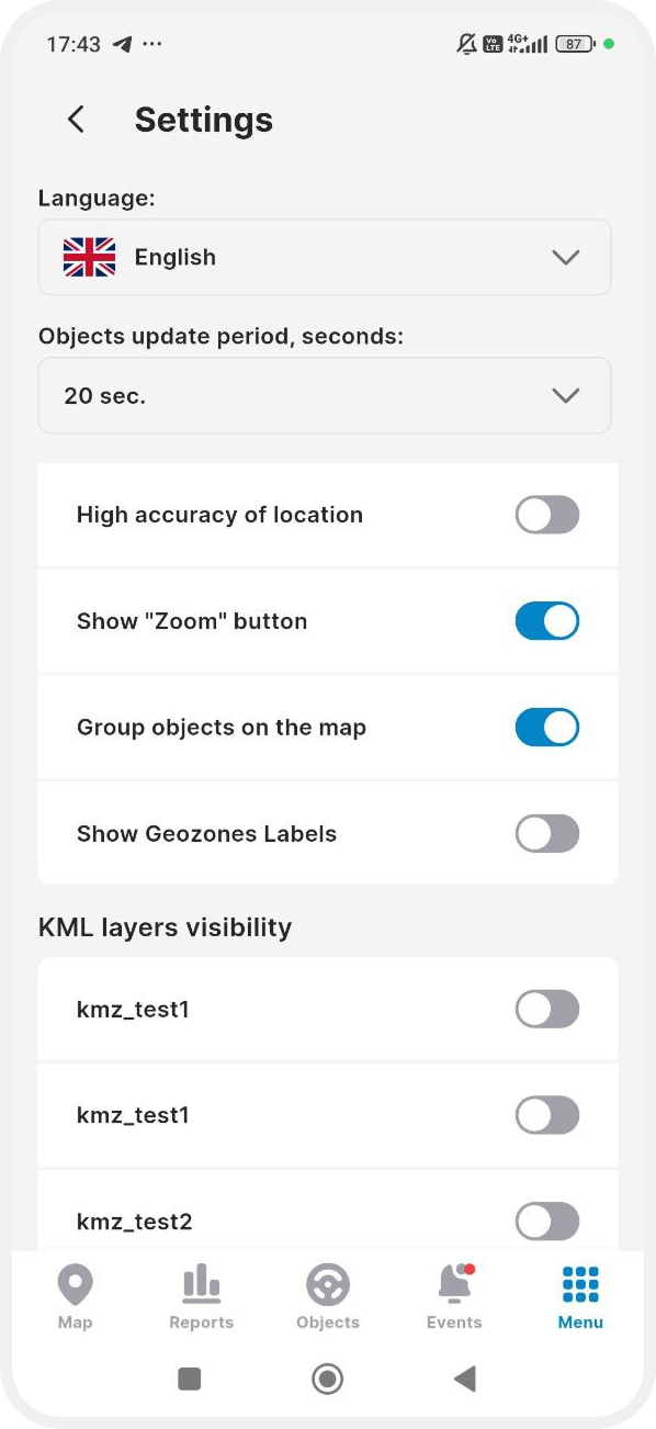 Visibility of KML layers — enable or disable the display of KML/KMZ layers that were uploaded in the web version (e.g., additional boundaries or objects) on the map