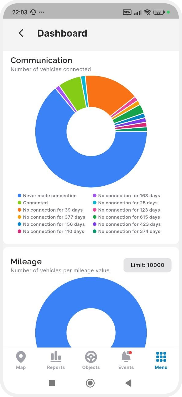 Below are charts that help you visually assess the situation, for example: “Vehicle status”, “Connection”, “Mileage”, “Geofences”, and others.