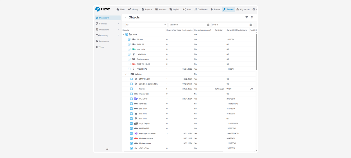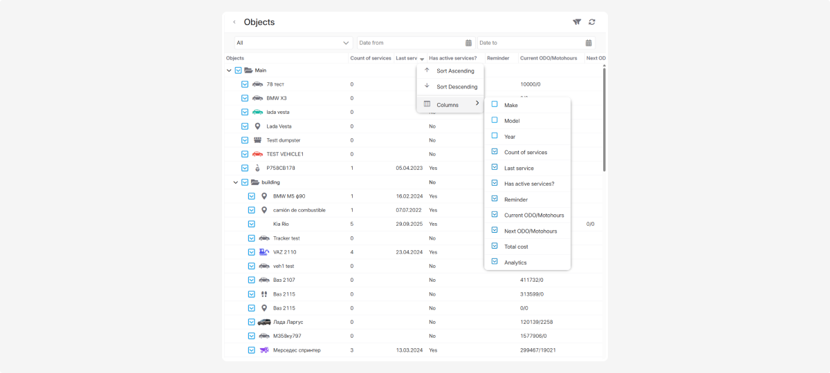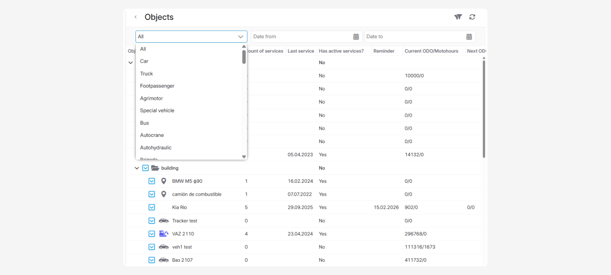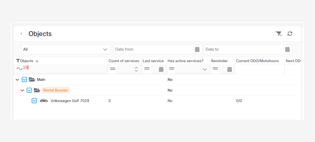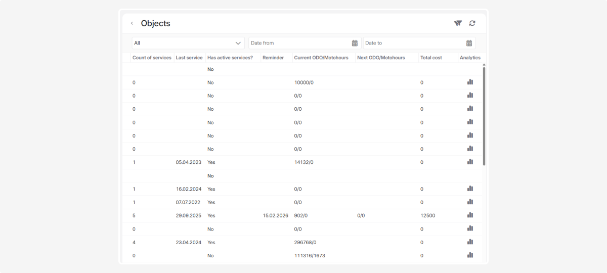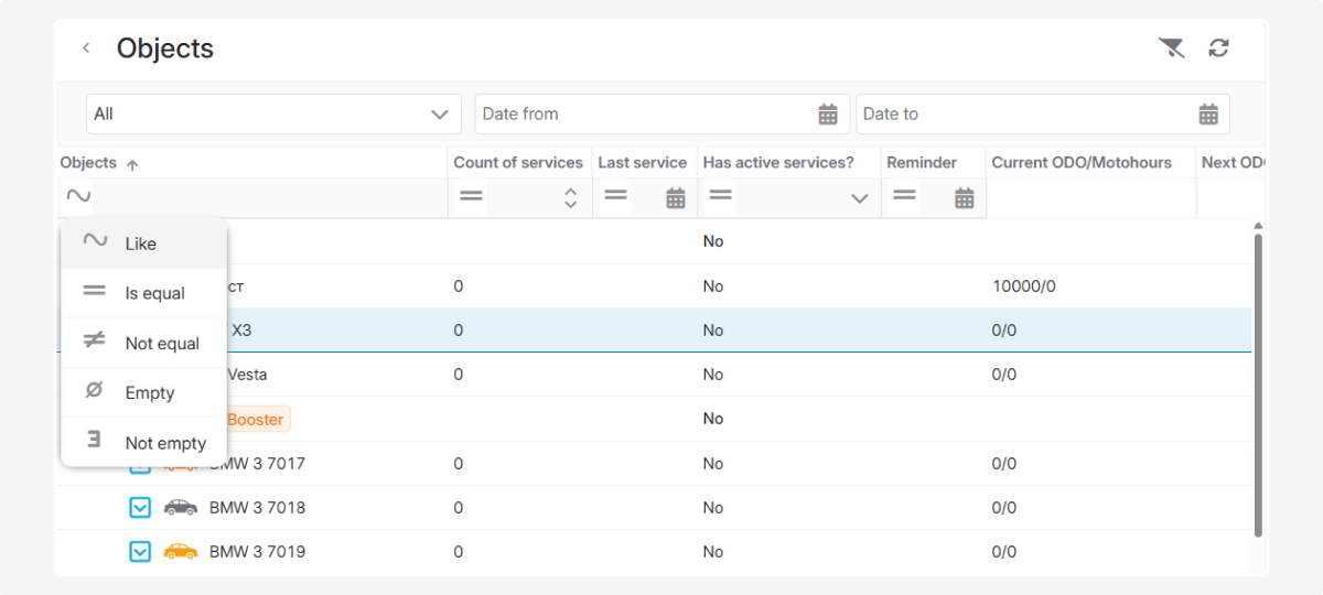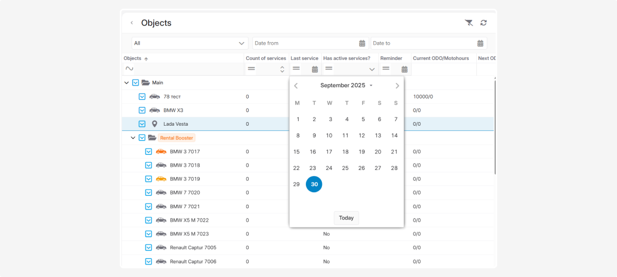In the Last service column, choose the Equals filter and specify a date (manually or from the calendar) — all objects serviced on that day will be displayed.