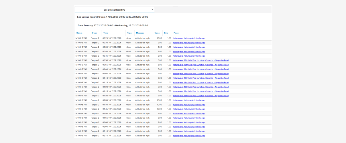 Eco Driving Report 2 is a detailed log of all detected violations. This report breaks down data to each specific event: when, where, and what type of violation occurred.