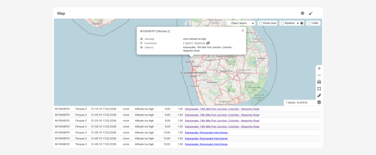 When you select a specific violation, its type and the location of the violation on the map will be displayed.