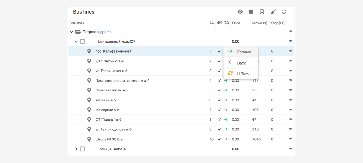 Once you add bus lines, the list will show all created lines and the number of stops in each.