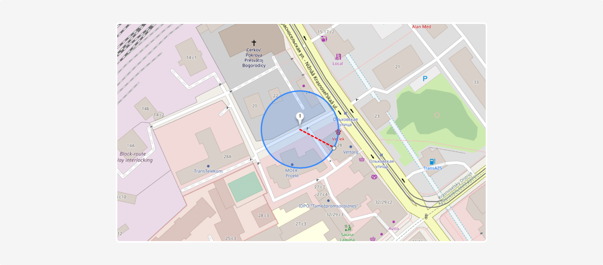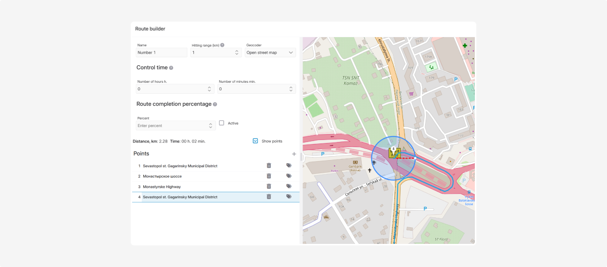 On the map, a route point is displayed as a numbered icon surrounded by a circle — this circle represents the detection radius. On the map, it appears as a red dashed line. The radius determines when a vehicle enters or exits the checkpoint area. When a vehicle enters the radius, the system records the point as visited.