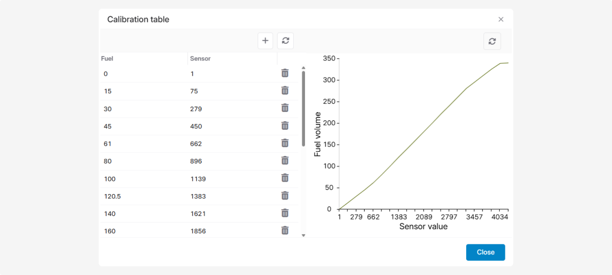 This type of calibration table is often used for fuel level sensors, weight, temperature, and humidity sensors.