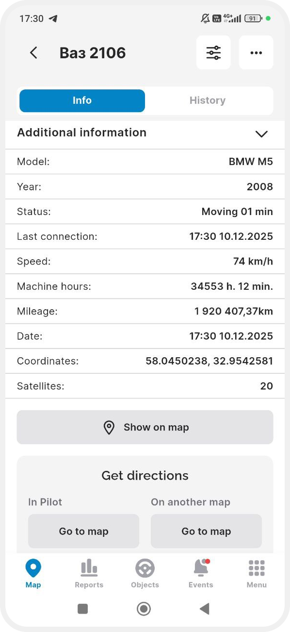 Additional information shows the basic object parameters: model, current status, time of the last connection, speed, and mileage.
