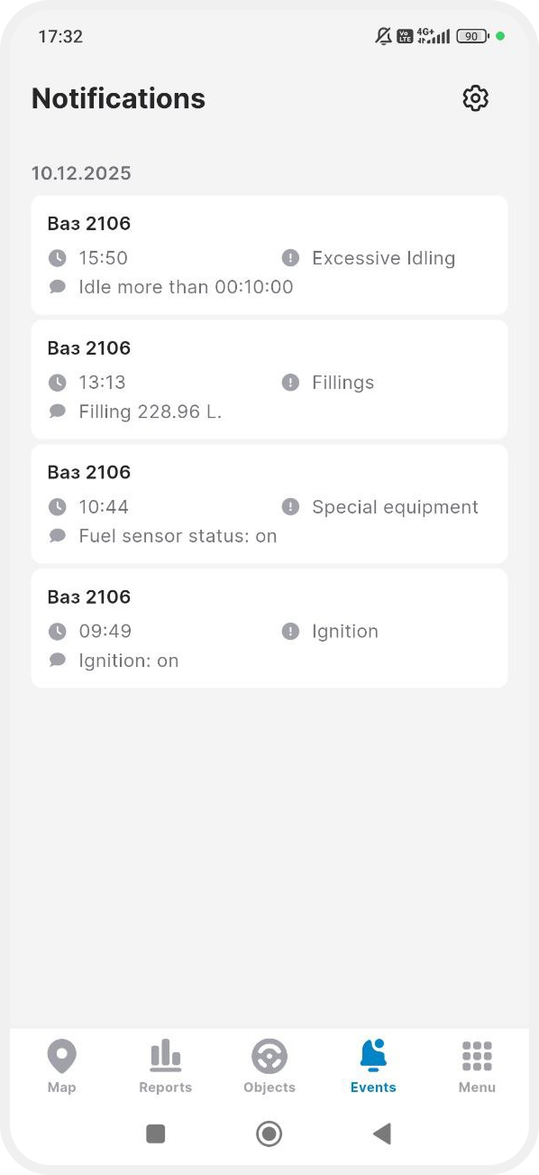 Notifications — view events for the object: time, place, event type. Using notification settings
