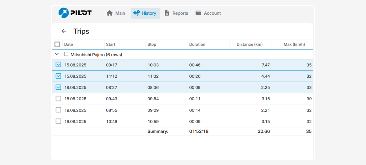 History shows information about an object’s past movements and statuses, including routes, stops, and sensor readings for a selected period.
