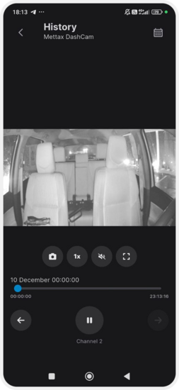 In the video history player, the date and the current time of the frame are displayed. You can quickly navigate to a specific moment in the recording by moving the slider.