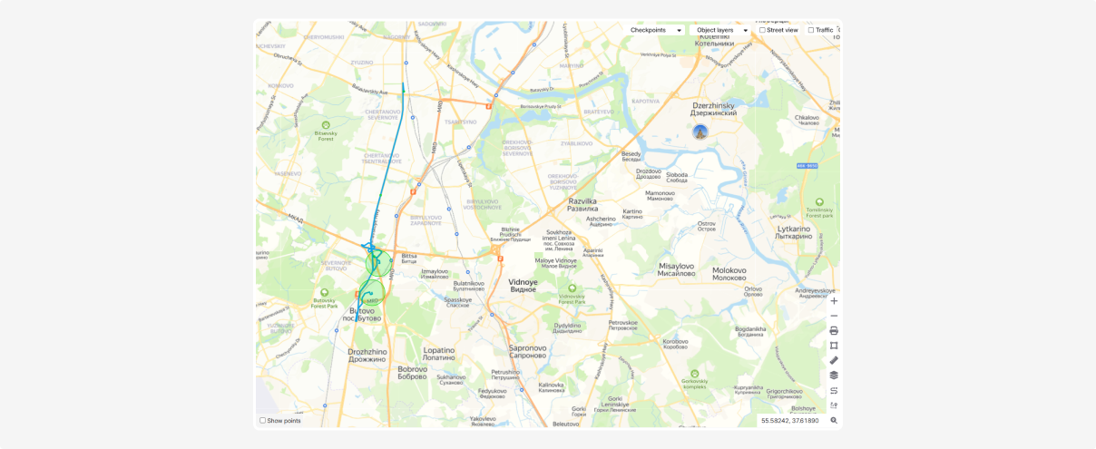Check the Show points box to display individual route points on the map.