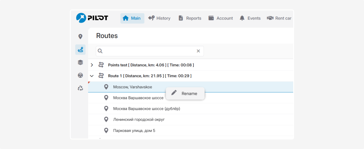 To open the menu and perform actions on a route, right-click on the desired route.