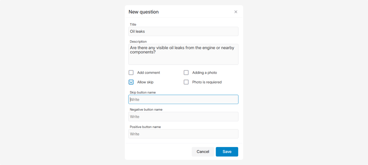 Button labels:— Positive answer (e.g., “Yes” / “OK”)— Negative answer (e.g., “No” / “Not working”)— Skip (if allowed, e.g., “Skip”)