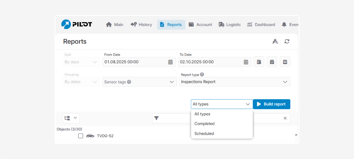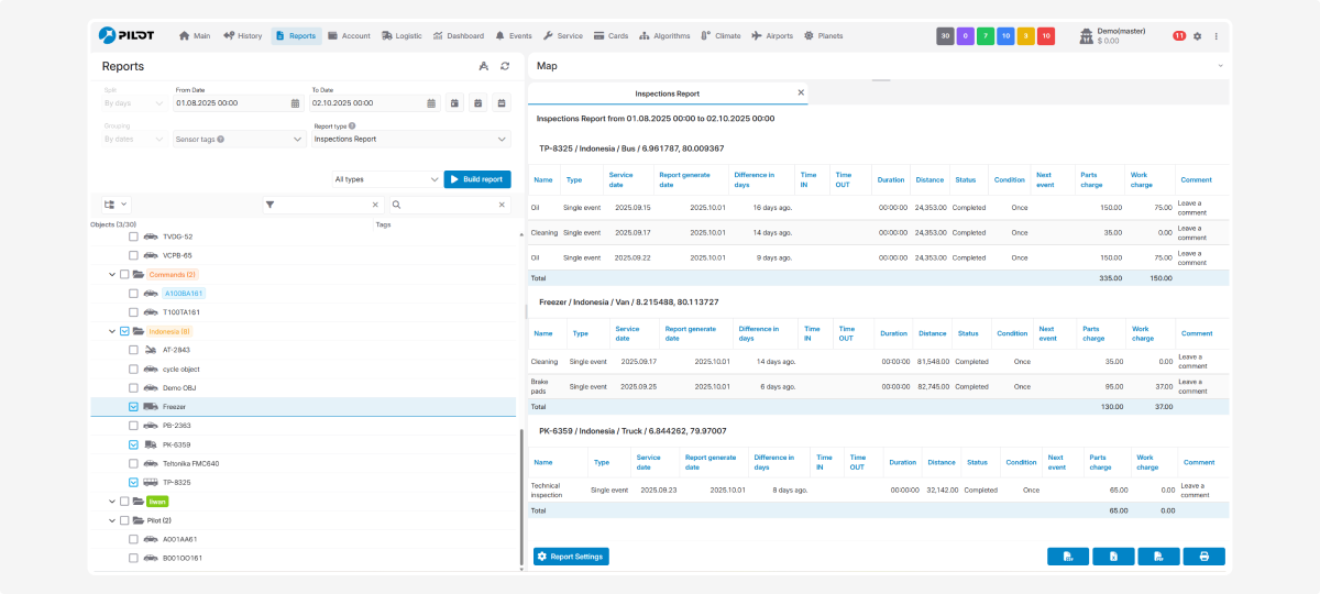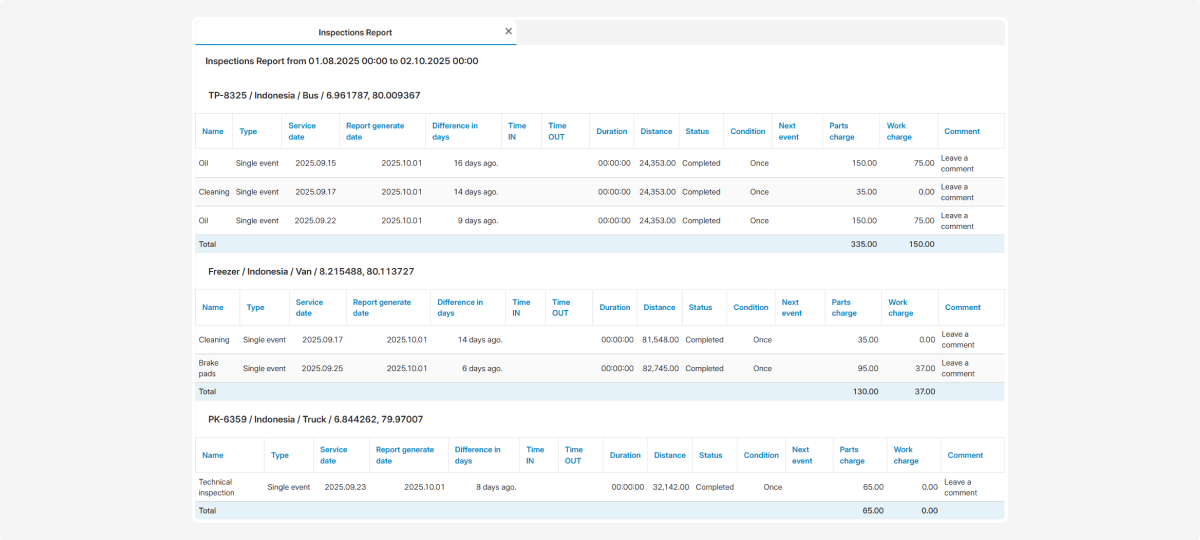 The Inspection report helps you track all completed and scheduled maintenance operations for each vehicle over a selected period.