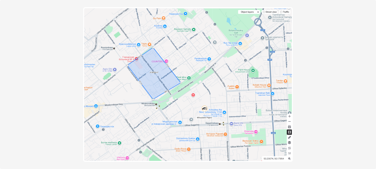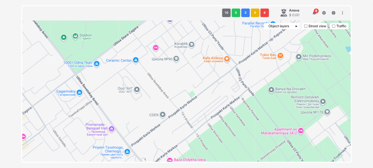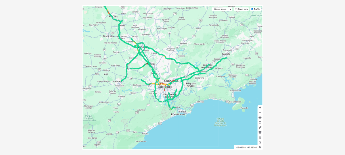 In the top-right corner of the map, you’ll find extra tools: object layers, street view, and traffic.