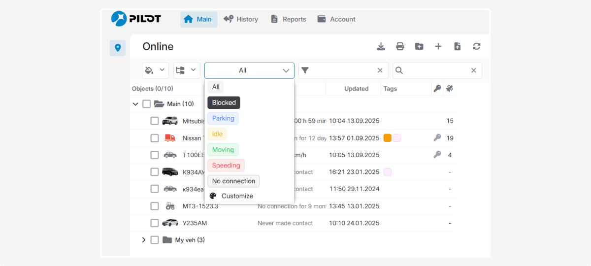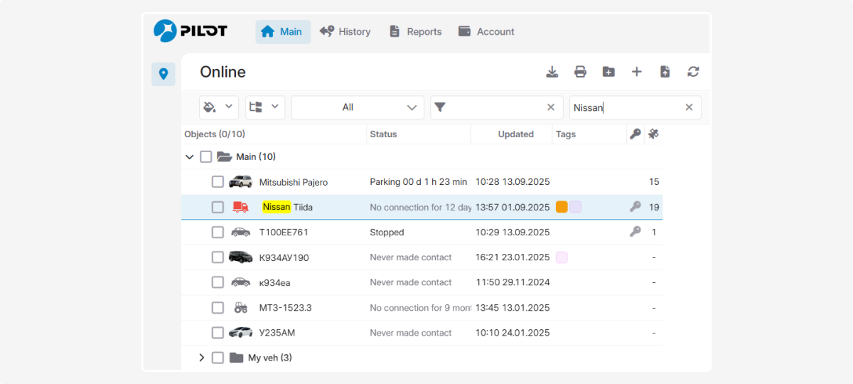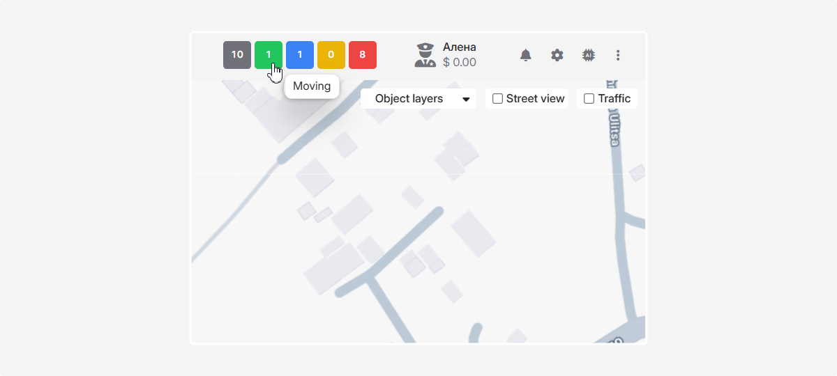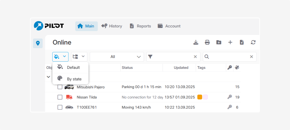 Color indicators in the list highlight each object in a specific color, which makes it easy to determine whether the object is moving, parked, or has problems.