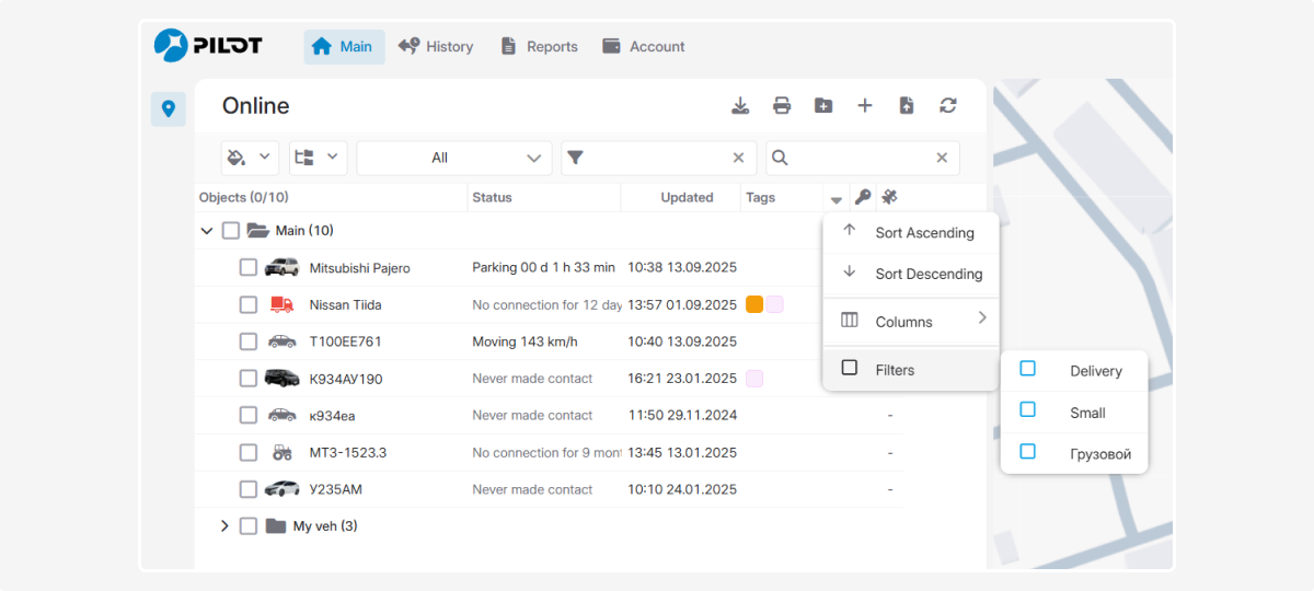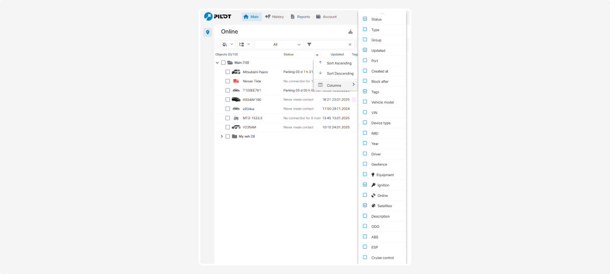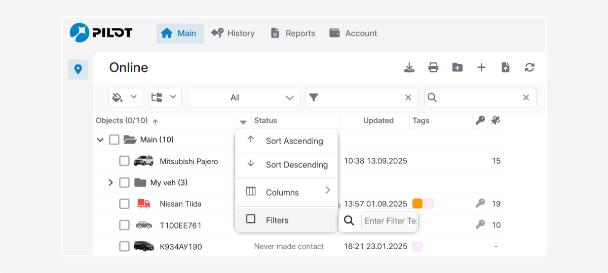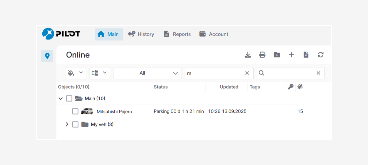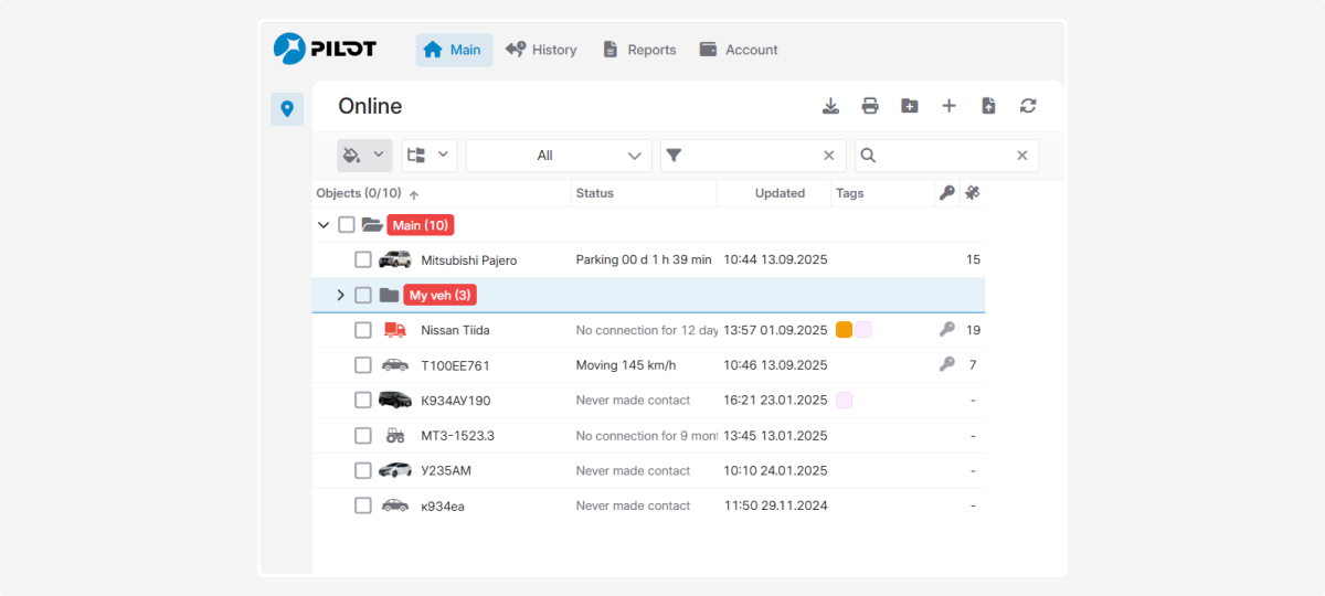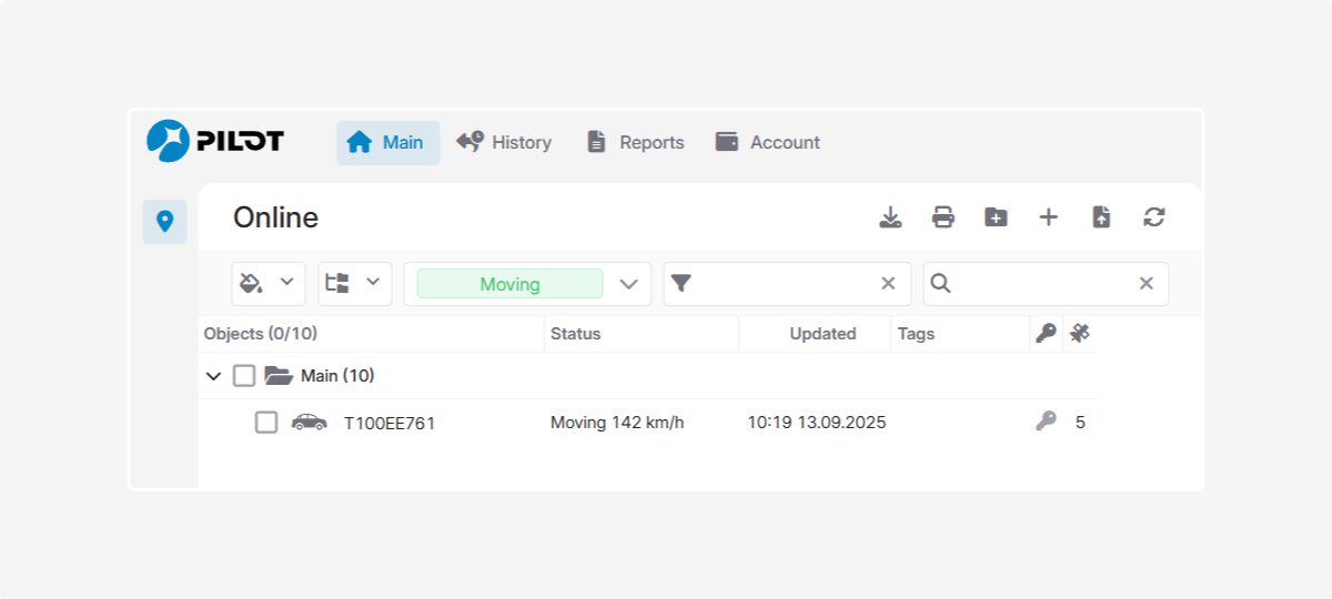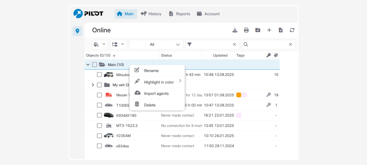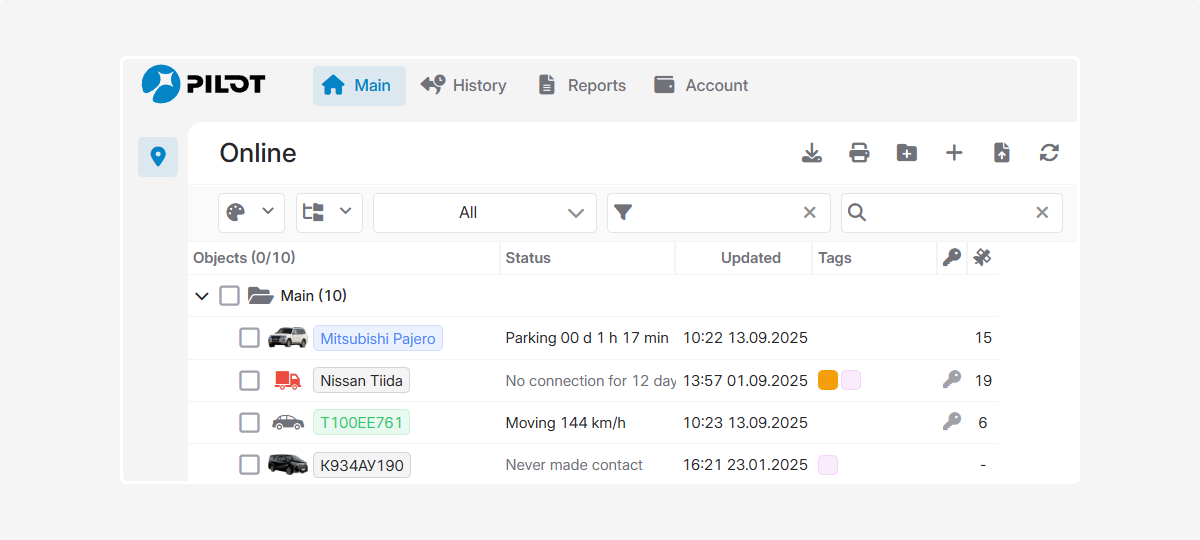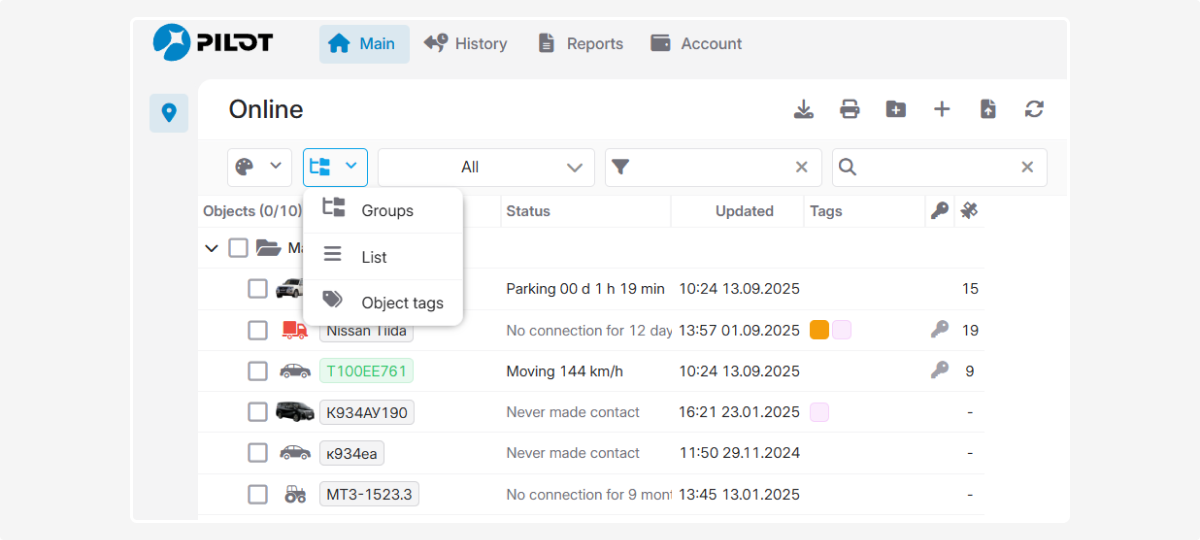 In the Online tab, you will find the list of objects. Here, you can monitor the status of your objects and control their parameters.