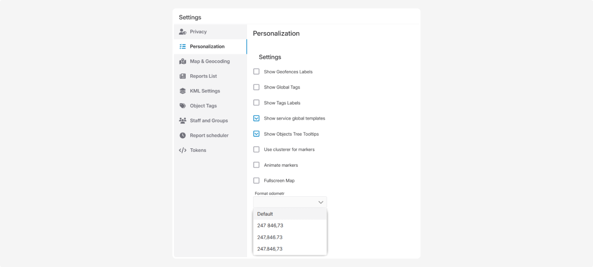 Odometer format — choose the display format for the odometer value (thousands and decimal separators)