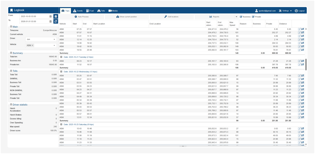 Driver Score – the overall score of the driver’s style: the higher the score, the more careful and economical the driving