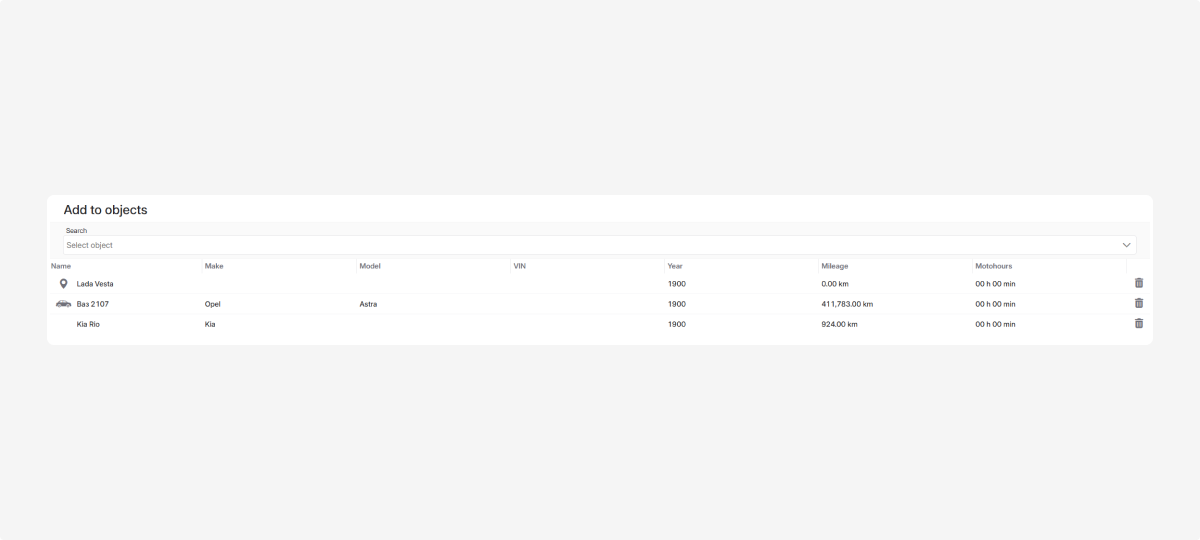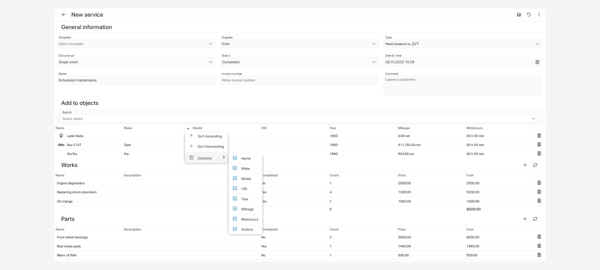 In a service record, you can manage tables for objects, jobs, spare parts, and reminders. Select which columns to display.