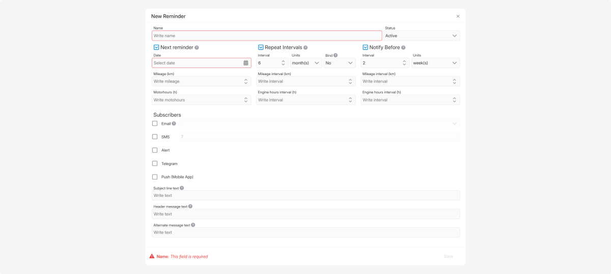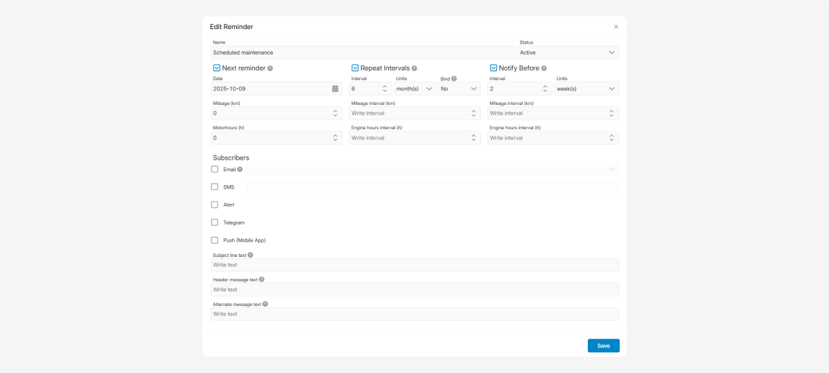 Reminder text:— Subject — what the reminder is about— Header — what will appear at the top of the message— Message text — you can use variables for automatic data substitution: