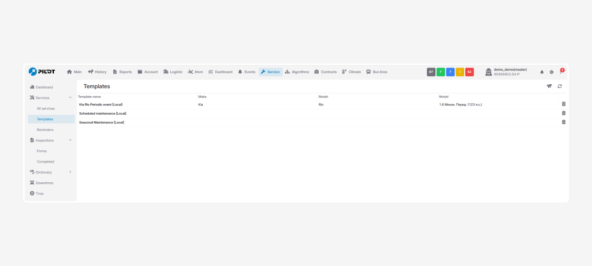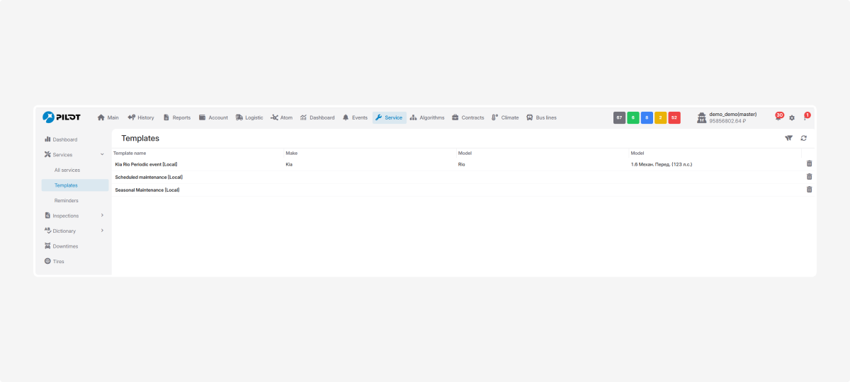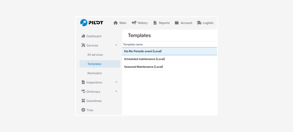 The Templates tab stores all saved service templates. Templates help quickly create new service records without re-entering all information.