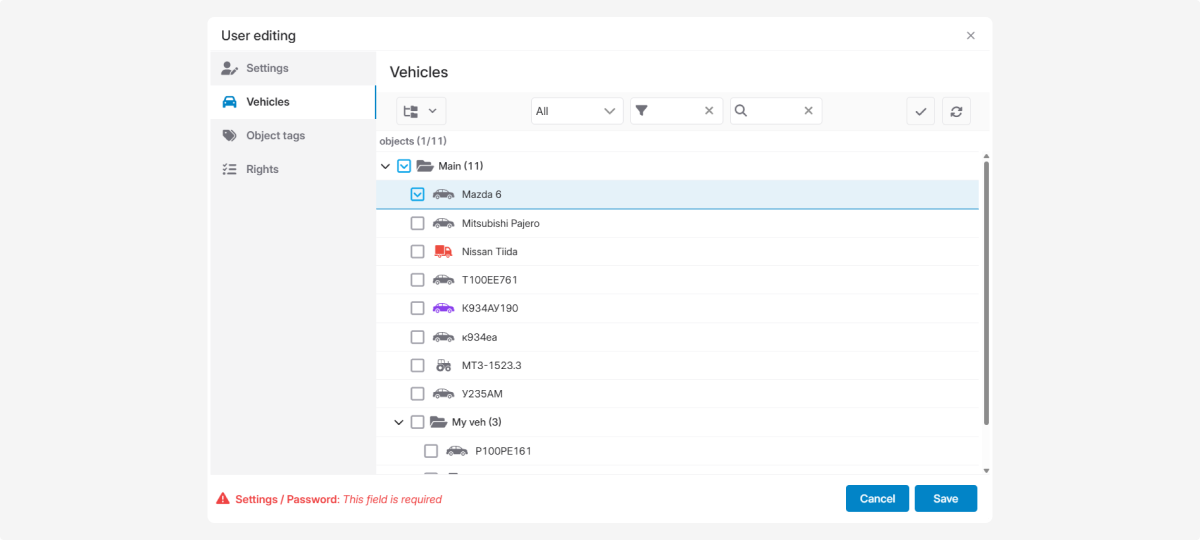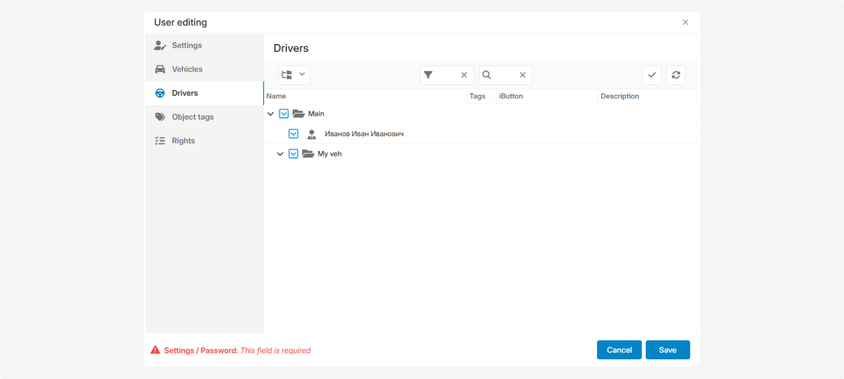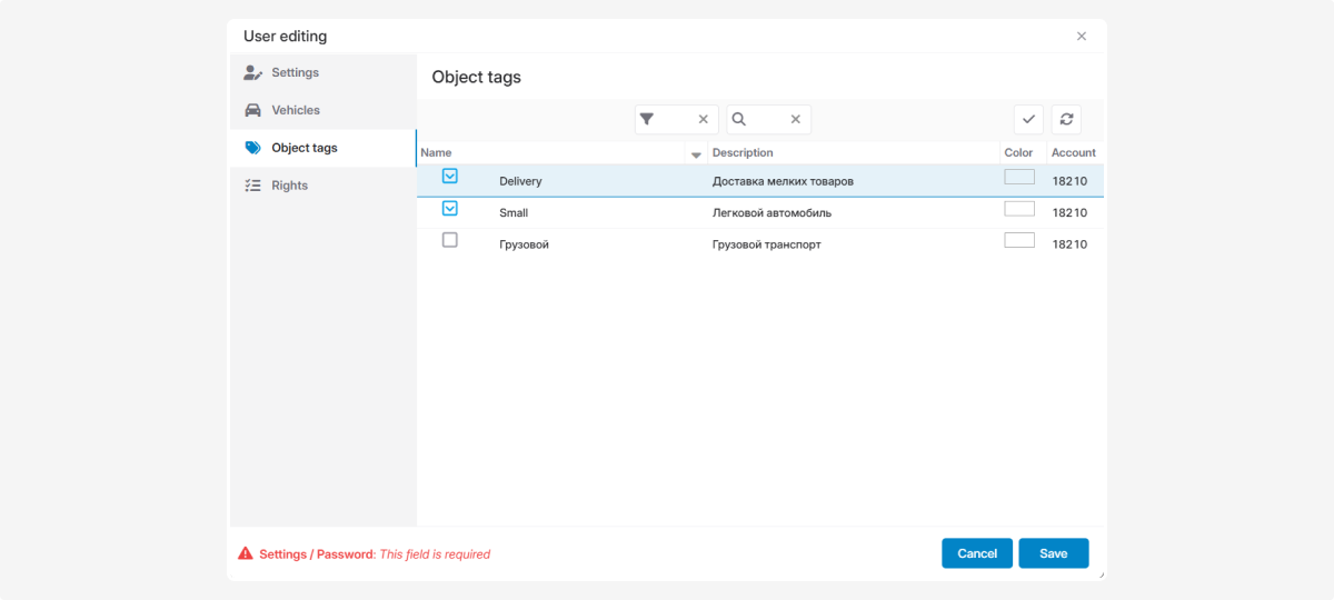 The user card lets you configure access for each employee (objects, tags, reports, view rights, etc.). You decide what information the user can see and what actions they can perform.