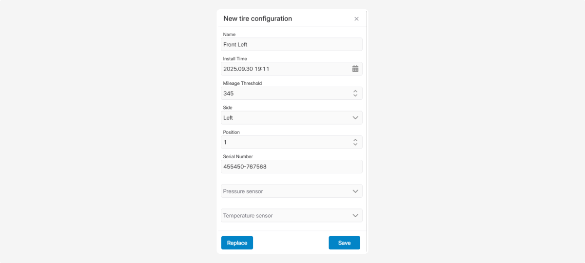 Pressure and temperature sensors (select from the list)3. Click Save — the tire will appear in the layout.