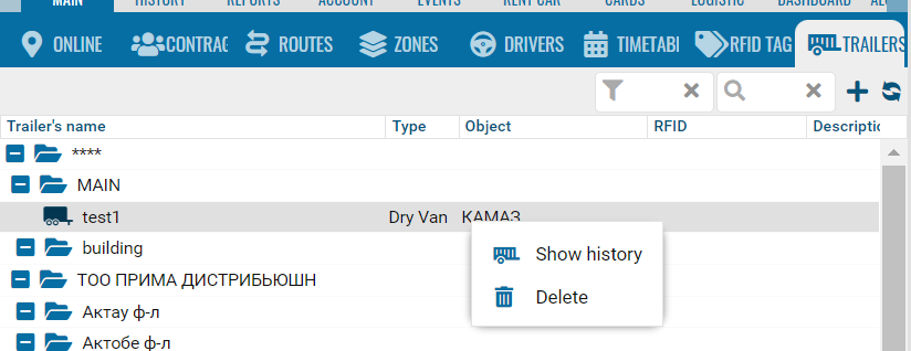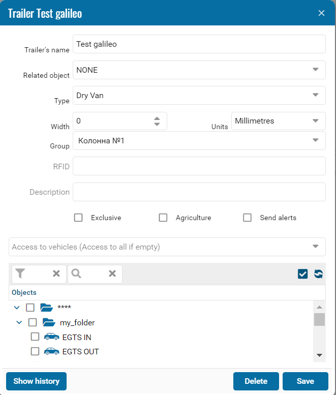 • Associated object - select from the drop-down list an object from the main tree of objects that will be considered associated with this trailer (not to which it will be attached, but from which it will receive data).