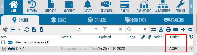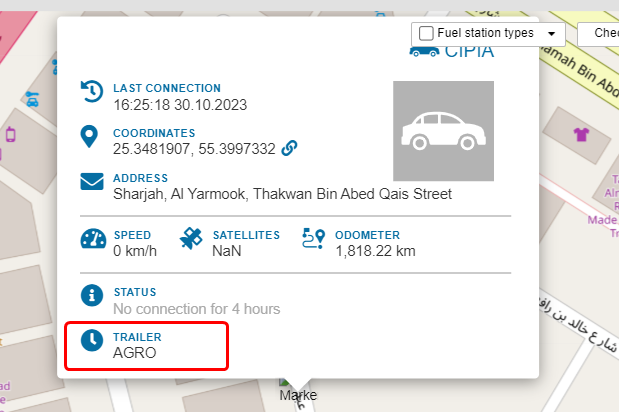 After attaching the trailer, the tractor icon changes to an icon with a trailer.