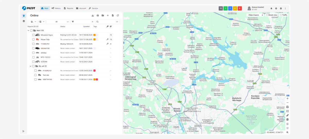 The PILOT user account is a tool for monitoring your assets. You can see where your vehicles, equipment, or staff are located, track their movements, and get detailed reports.
